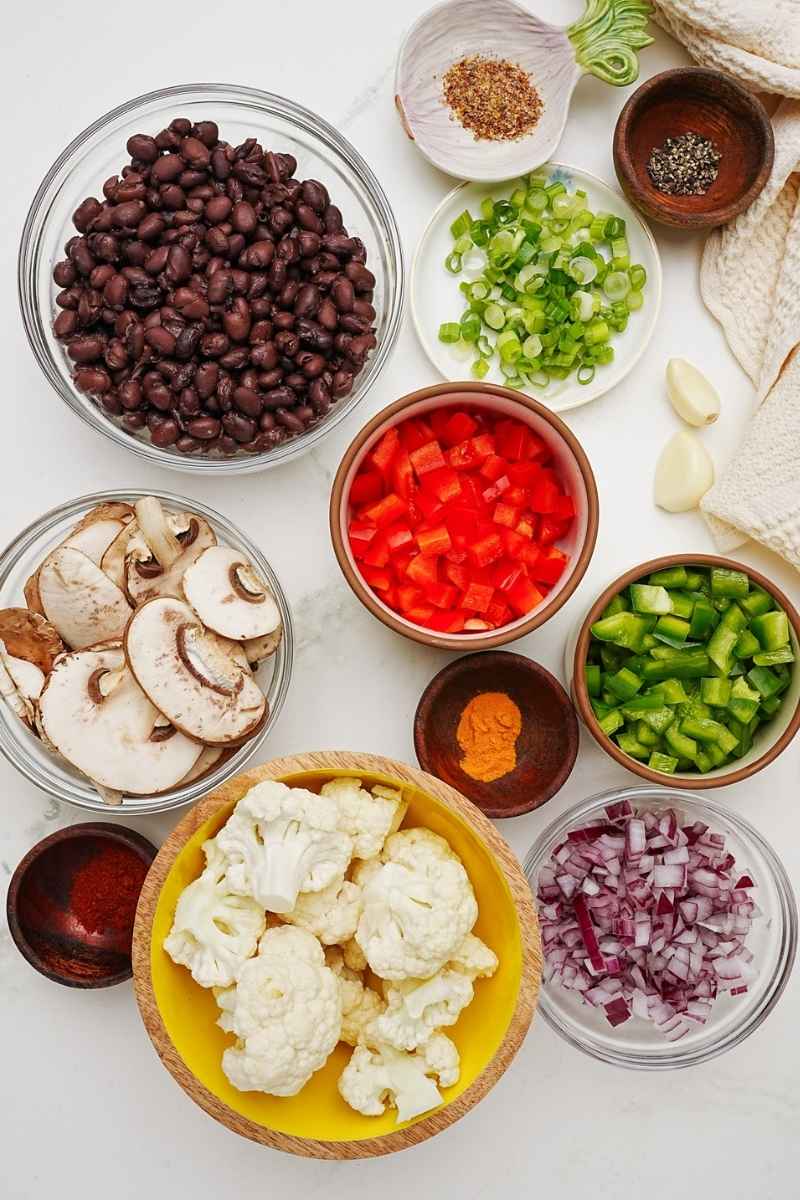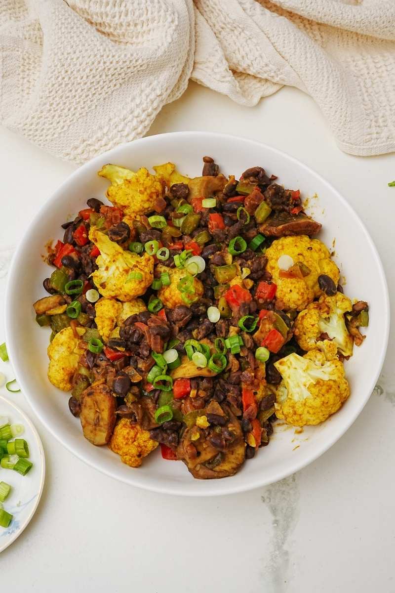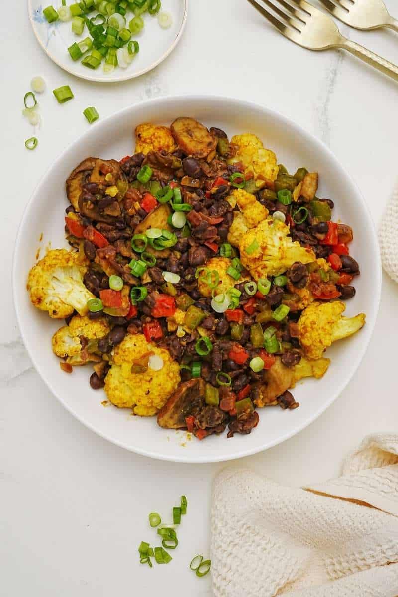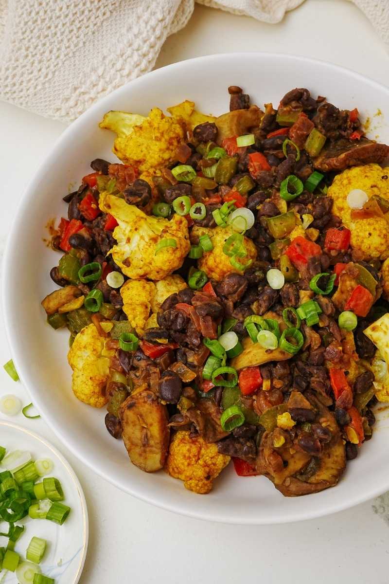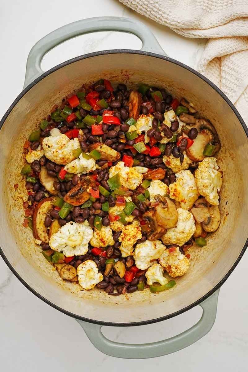 - Add the cauliflower to the pan and cook for another 5 minutes, or until tender. Stir in the beans until thoroughly combined, then season with black pepper, turmeric, cayenne, and garlic. Cook for 5 minutes more to allow the flavors to meld.