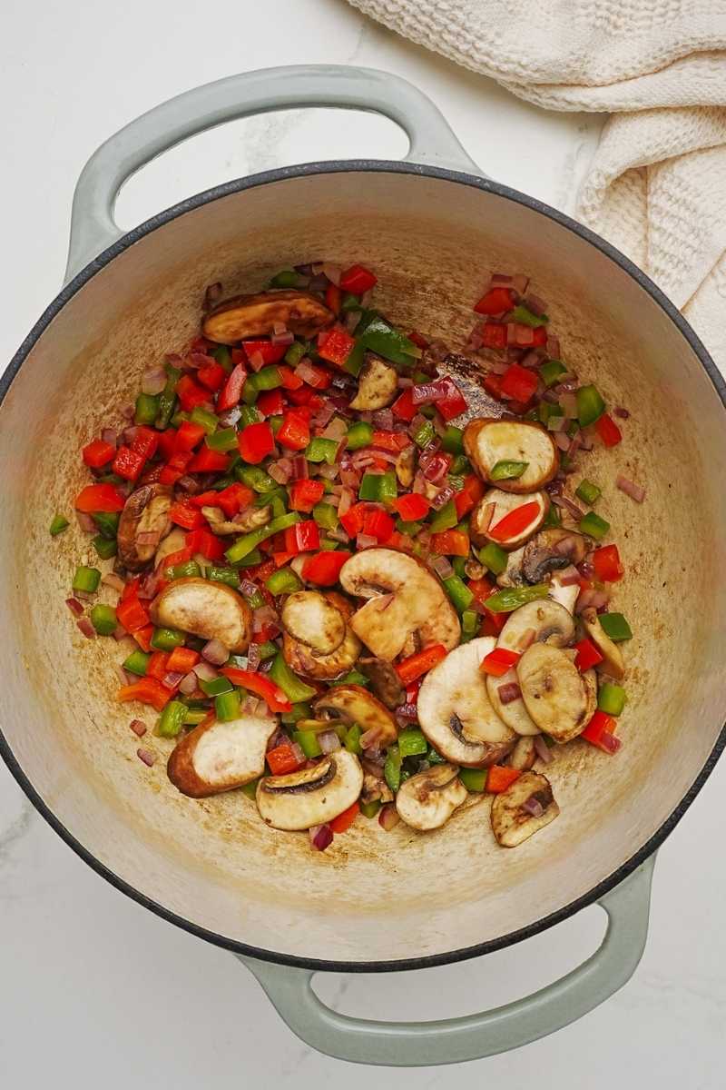 - In a large skillet over medium heat, sauté the diced onion, peppers, and mushrooms for 5 minutes, or until just beginning to soften. Add water as needed to prevent sticking (1–2 tablespoons at a time).