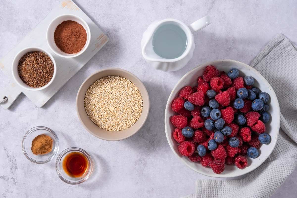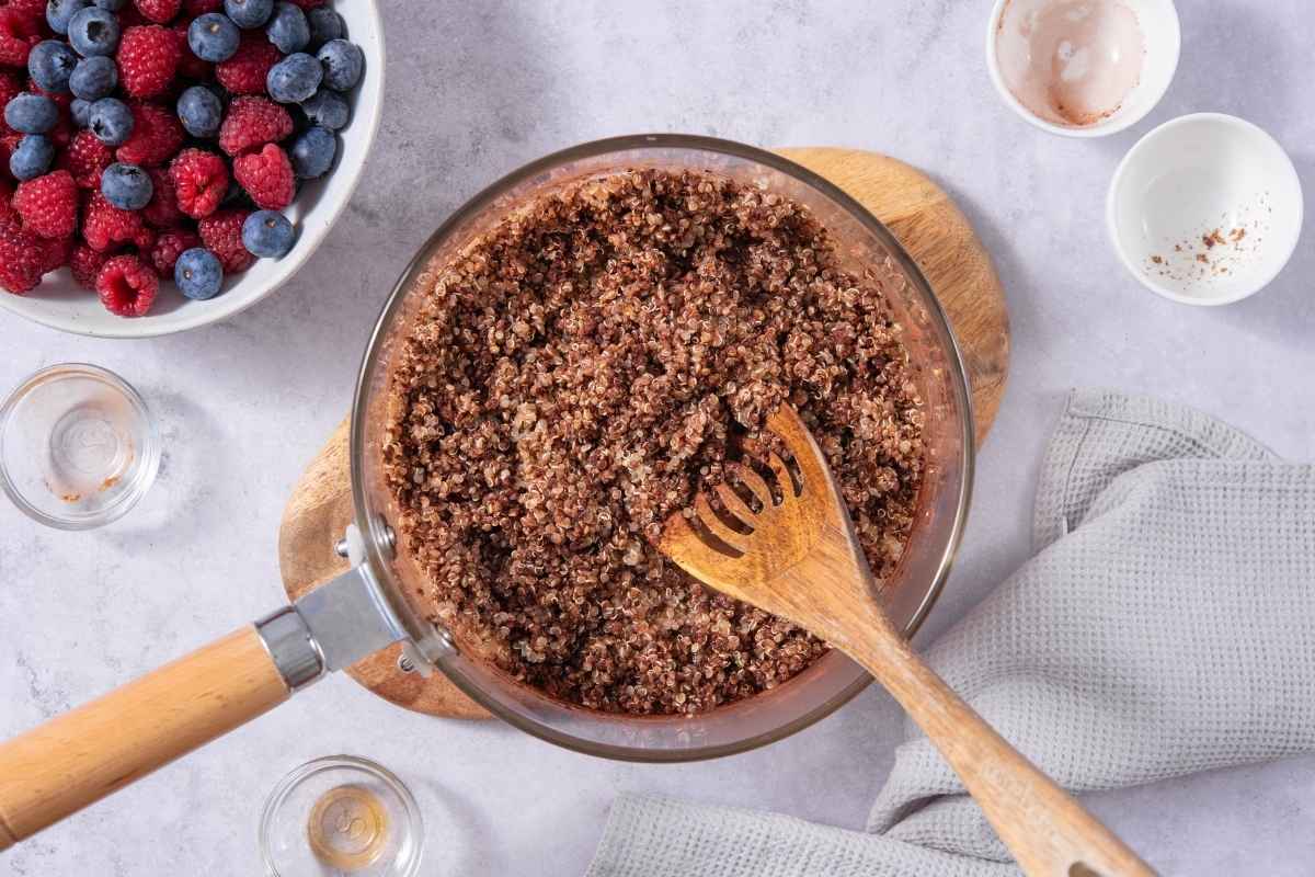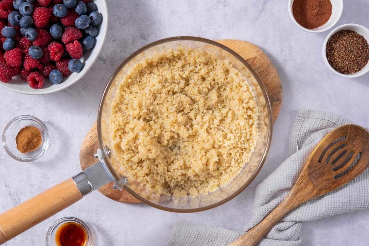 Quinoa provides the foundation for this dessert, offering complex carbohydrates and plant-based protein that help slow digestion and promote steady energy.