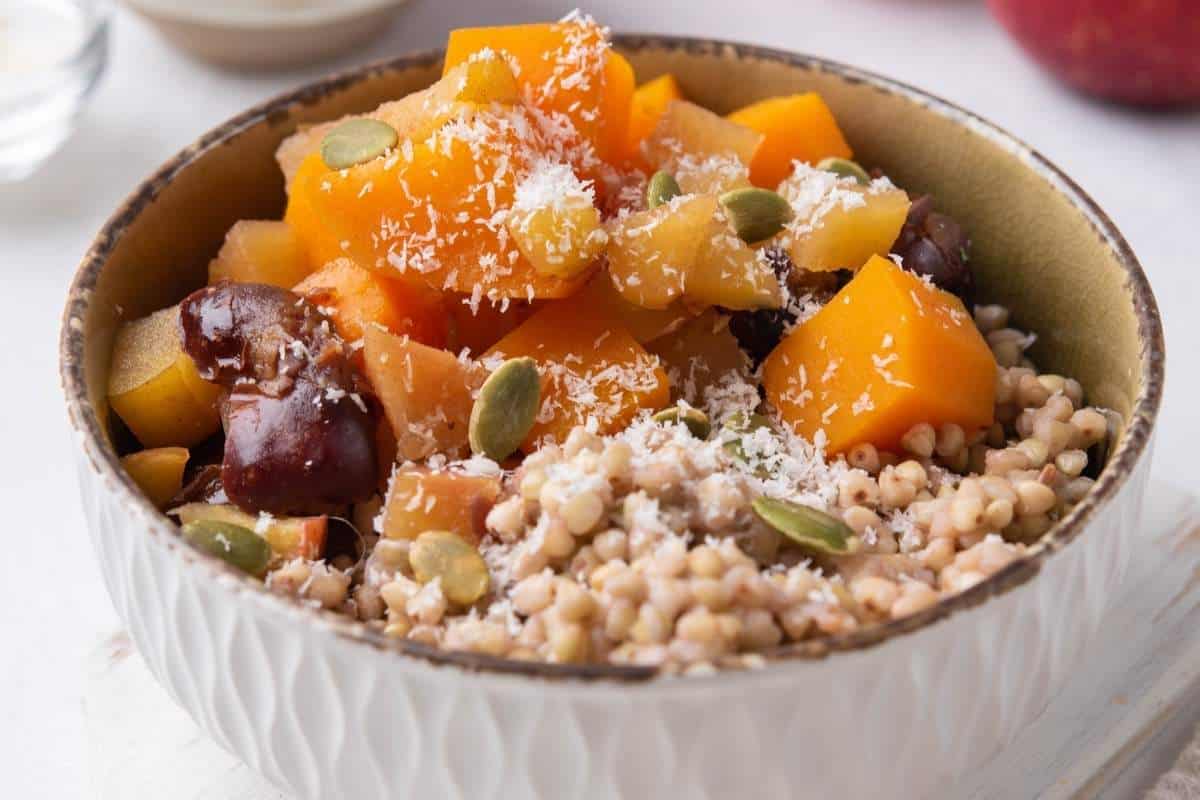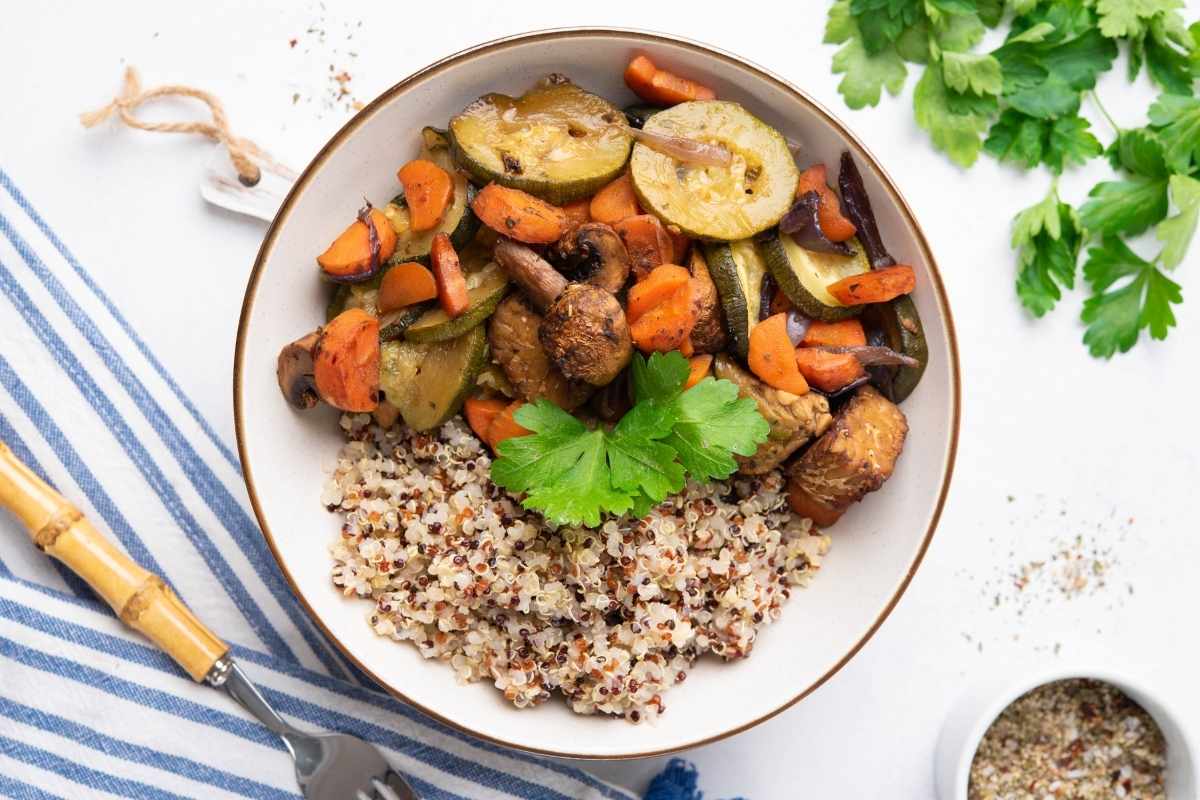 Lunch is where fiber really adds up. A well-built bowl — like a Balsamic Roasted Tempeh Bowl — typically includes: