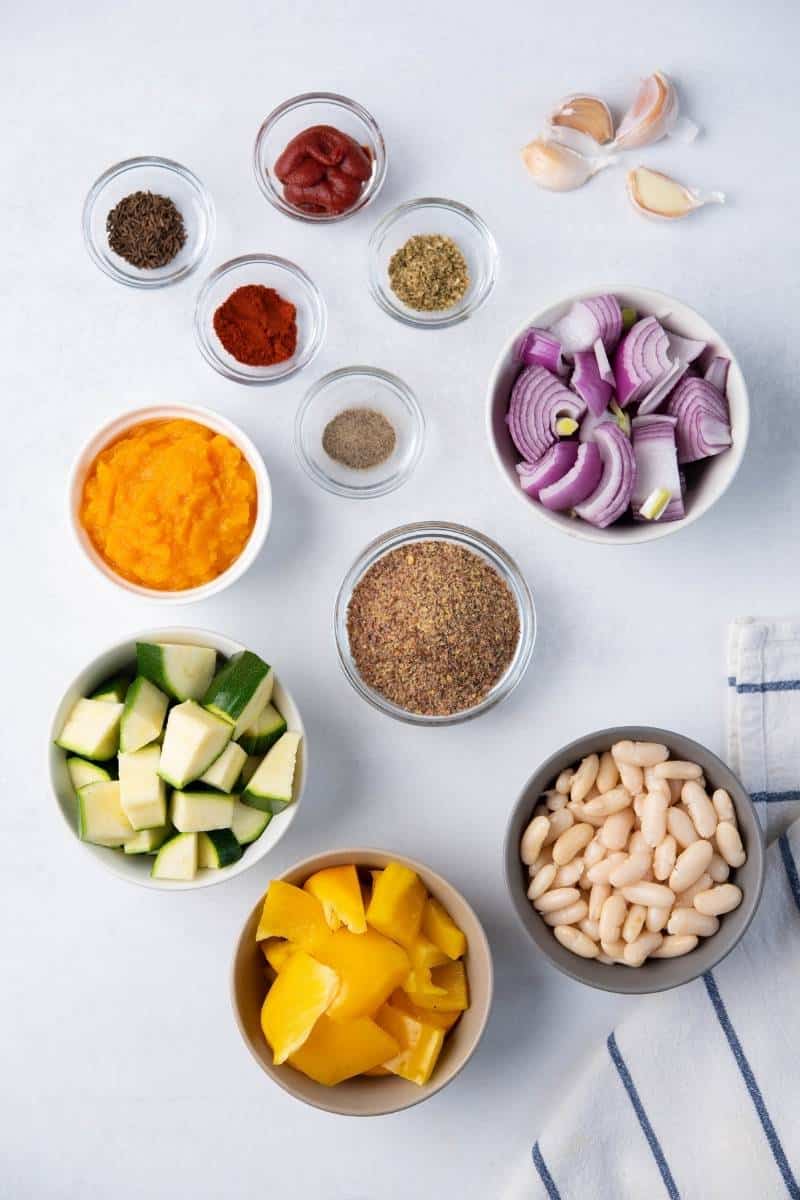 - Add the white navy beans, pureed pumpkin, red onion, yellow bell pepper, zucchini, and garlic into the food processor, and pulse until smooth.