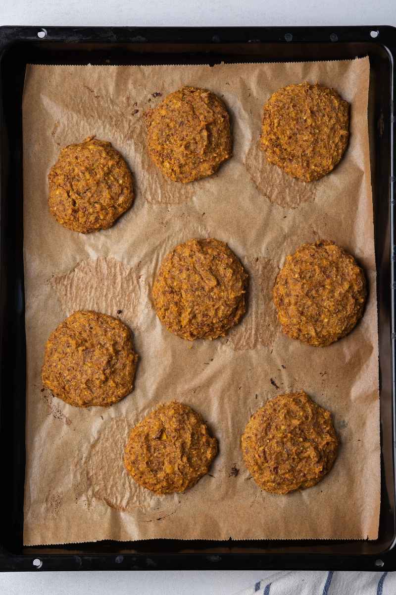 - Form the mixture into patties and place on the baking sheet. Bake for 40 minutes, carefully flipping at the halfway point. Burgers should be golden brown on the bottoms.