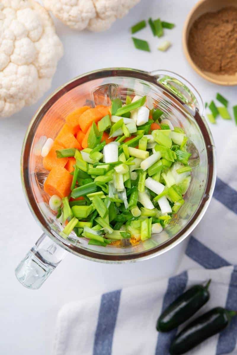 - Place all ingredients in the blender (except the cauliflower). Blend until smooth