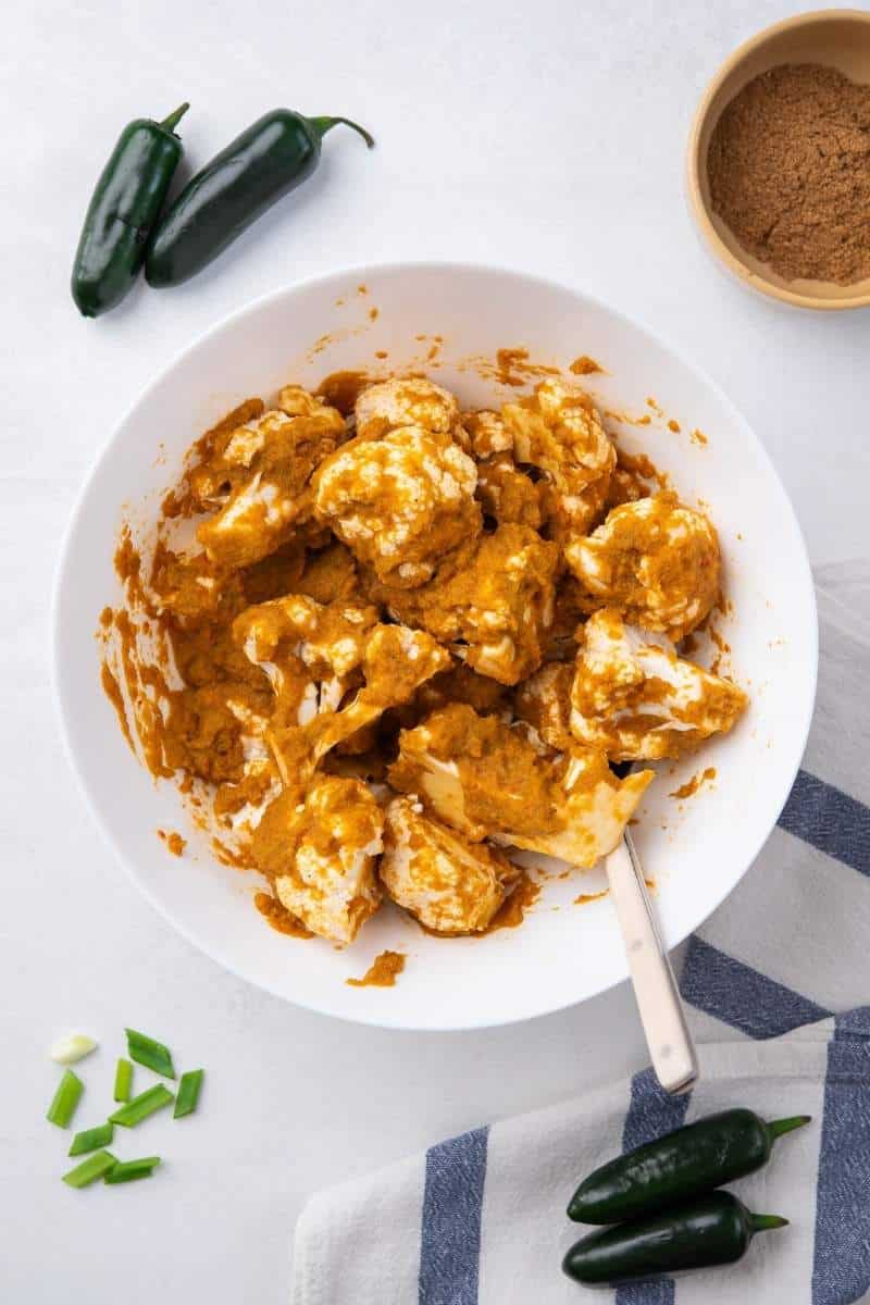 - Break up the cauliflower and put into a bowl. Pour the sauce on top of cauliflower and mix well.